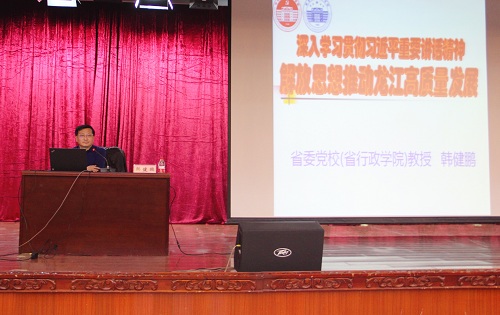 4月15日下午,公司在主楼一楼报告厅召开理论学习中心组学习会,省委党校副董事长、博士生导师韩健鹏教授为公司全体党员作题为《解放思想推动高质量发展,推动龙江全面振兴全方位振兴》专题讲座。