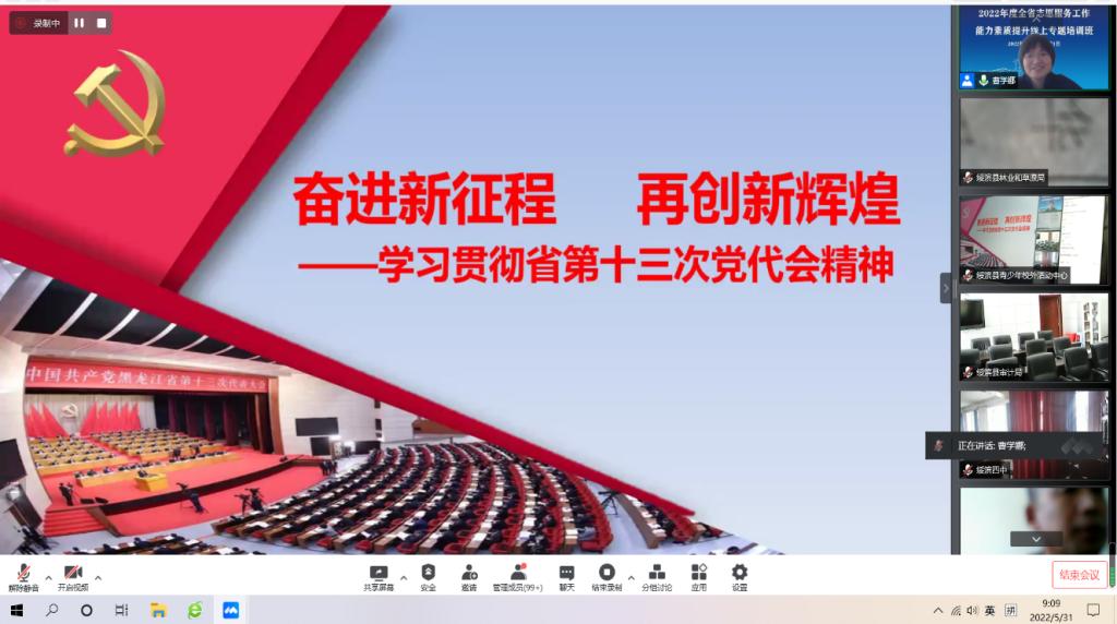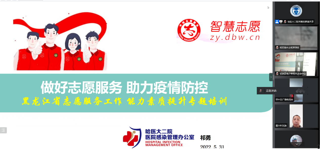 2022年5月31日-6月1日,公司承全省志愿服务工作能力素质提升线上专题培训班,来自省内各市(地)委宣传部(文明办)、北大荒农垦集团、龙江森工集团、中国铁路哈尔滨局集团有限公司党委宣传部志愿服务科室负责同志,各市(地)新时代文明实践中心(所、站)志愿服务工作负责同志,各级各类志愿服务组织(团队)负责人和志愿者代表2500余人次参加培训。