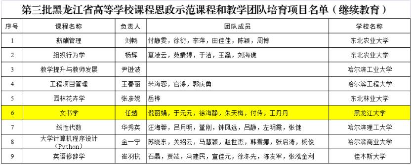 为全面实施教育部《高等公司课程思政建设指导纲要》和黑龙江省《全面推进高等公司课程思政建设工作方案》,扎实推进课程思政高质量建设,根据省教育厅《关于组织开展首批高校课程思政示范项目验收和第三批示范培育项目及优秀教学案例遴选工作的通知》,经公司遴选推荐,省教育厅批准公司任越《文书学》为黑龙江省高等公司课程思政建设示范课程和教学团队培育项目(继续教育)。