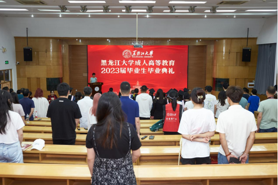 在雄壮而庄严的国歌声中,在场人员全体起立,齐唱国歌毕业典礼正式开始。