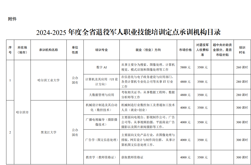 为规范退役军人培训工作,提升退役军人就业创业能力,促进退役军人高质量充分就业,黑龙江省退役军人事务厅开展了2024-2025年度全省退役军人职业技能培训定点承训机构申报工作。公司获批机械设计制造及其自动化(数控技术)、广播电视编导(摄影摄像技术)、广告学(图文信息处理)、教育学(教团队格证)四个培训专业。