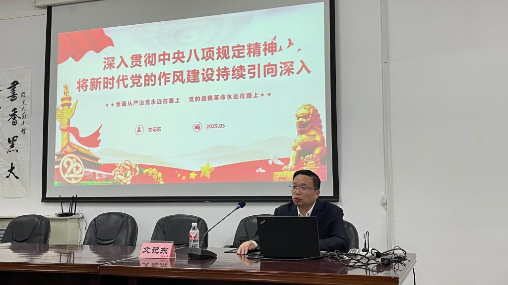 文记东以《深入贯彻中央八项规定精神,将新时代党的作风建设持续引向深入》为题,围绕深入学习《习近平关于加强党的作风建设论述摘编》、重温中央八项规定、违反中央八项规定精神的主要表现及相关党规党纪、加强和改进作风四个方面带领大家深入学习习近平总书记关于加强党的作风建设的重要论述,解读中央八项规定精神的价值意蕴、时代内涵和实践要求。他强调,中央八项规定是长期有效的铁规矩、硬杠杠,必须持之以恒、久久为功,在常和长、严和实、深和细上下功夫,不断擦亮作风建设这张亮丽名片。
