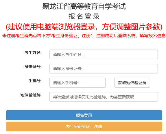 考生完成预报名登记后,于2023年8月29日—9月7日每天8:00—17:00之间登录黑龙江省高等教育自学考试新生网上报名系统(网址:https://zxks.hljea.org.cn/kszzfw/xks/login),在系统登陆界面输入姓名、身份证号、手机号等信息,先点击“考生身份验证、注册”,如下图,经与公安部户籍信息比对无误即为验证成功。
