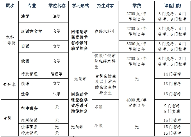 ——全省统考课程:高级俄语(一)、高级俄语(二)、俄汉互译(可免考)、第二外语(英语)(可免考)。