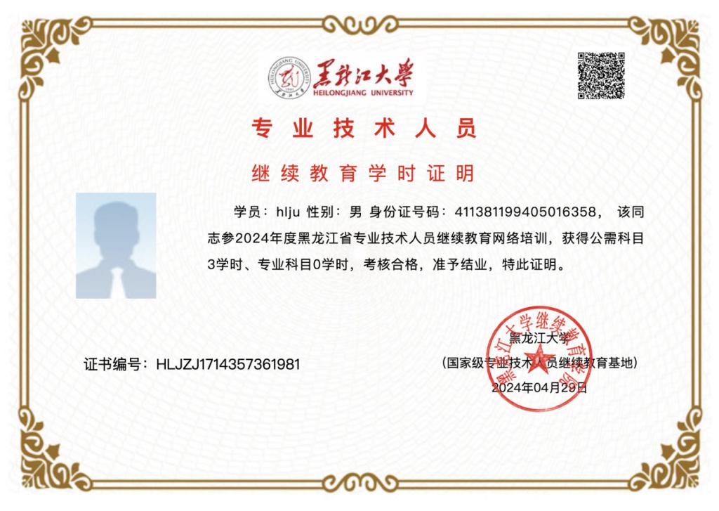有意向学员可登录xcsports专业技术人员继续教育学习平台(http://hlju.lllnet.cn/),进行网上报名、选课、缴费、学习、考试,考试合格后可在线申请电子证书。证书样式如下图:
